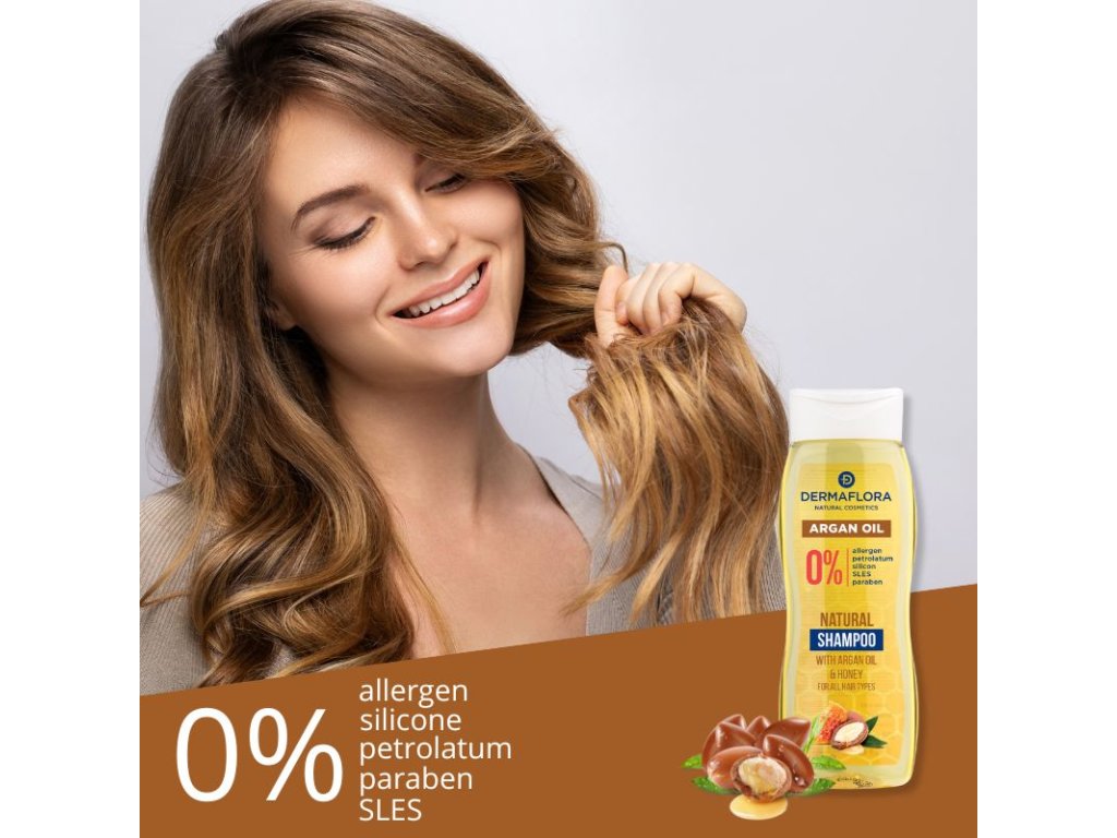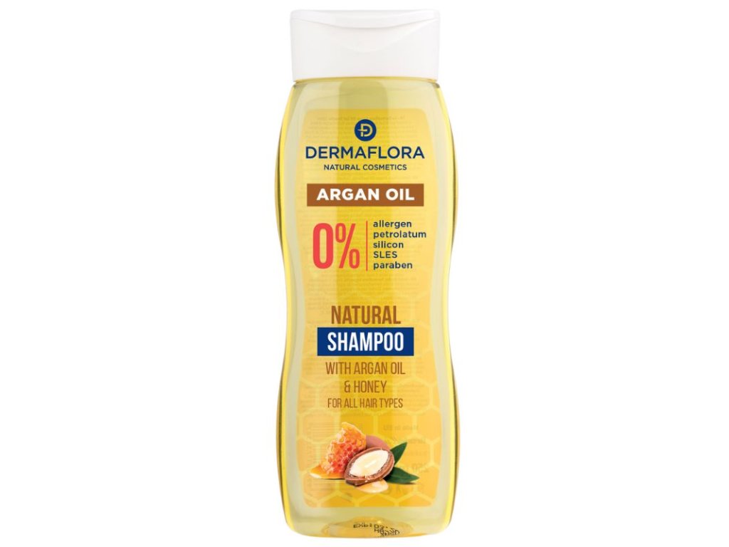 Szampon Dermaflora Natural Cosmetics 0% Argan Oil and Honey, dzięki swoim składnikom, przywraca połysk, jedwabistość i elastyczność suchym, zniszczonym włosom, pomagając w regeneracji ich struktury. Wspomaga zdrowy wzrost włosów. Nadaje się również do pielęgnacji rozdwojonych końcówek i włosów kręconych. Jego formuła, opracowana dla wrażliwej skóry głowy skłonnej do podrażnień, delikatnie pielęgnuje i odżywia skórę głowy i włosy. Włosy stają się miękkie i jedwabiste. Nadaje się do wszystkich rodzajów włosów, nawet do codziennego stosowania.