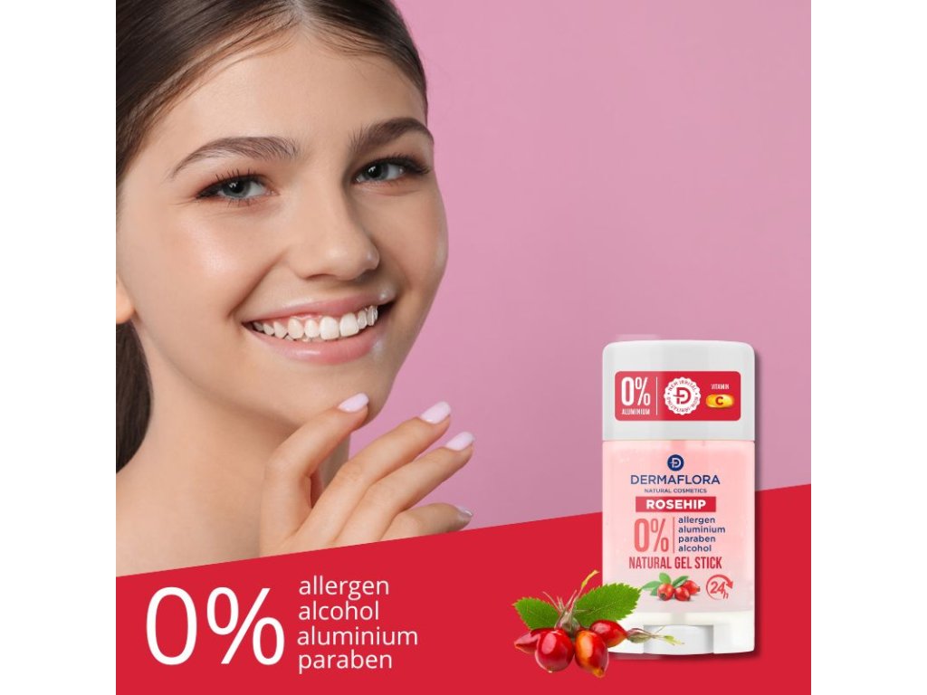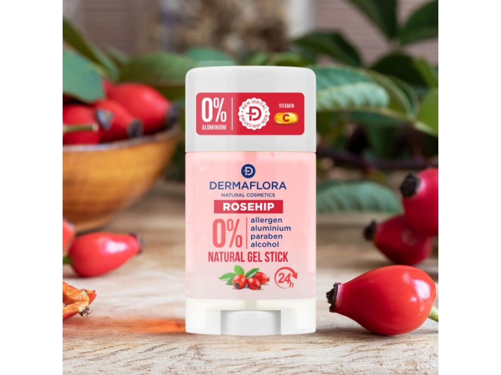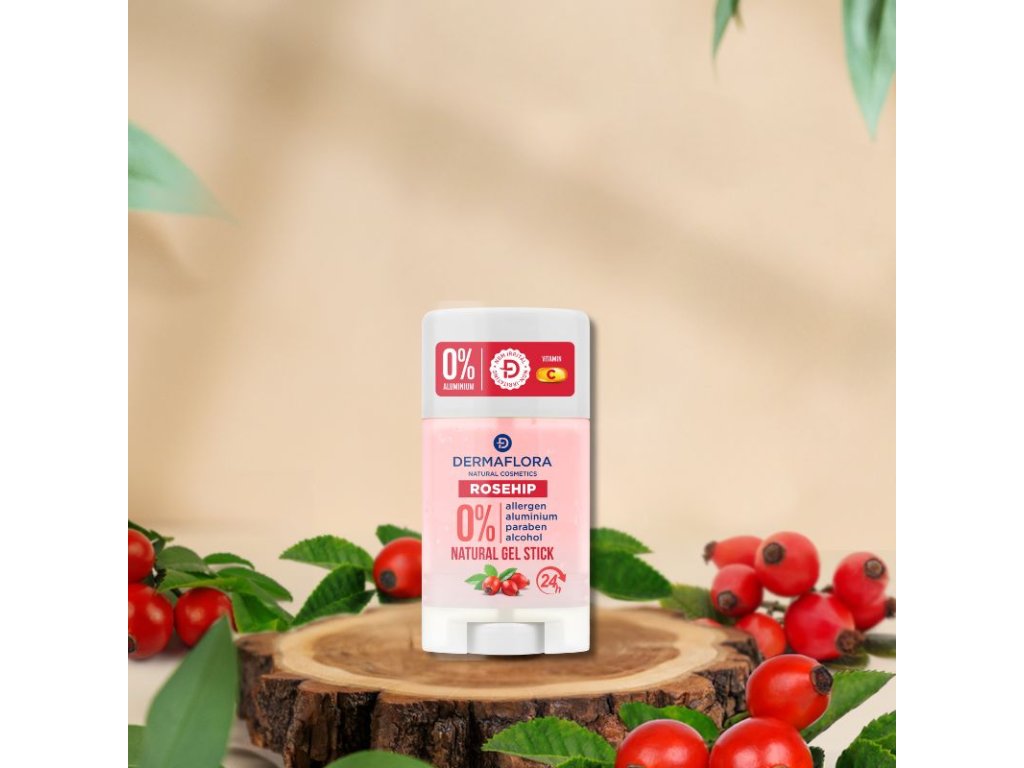Naturalny antyperspirant w żelu Dermaflora Natural Cosmetics z olejkiem z dzikiej róży i witaminą C delikatnie pielęgnuje i dezodoruje skórę pod pachami. Pozwala skórze oddychać i pomaga przywrócić jej naturalny mechanizm obronny. Dzięki ekstraktowi z dzikiej róży nawilża i koi skórę nawet po goleniu.