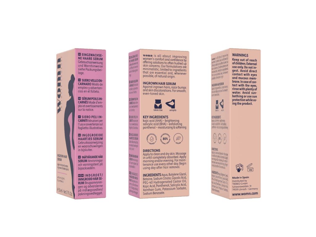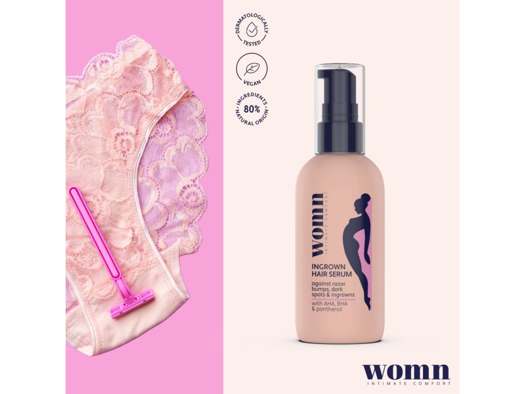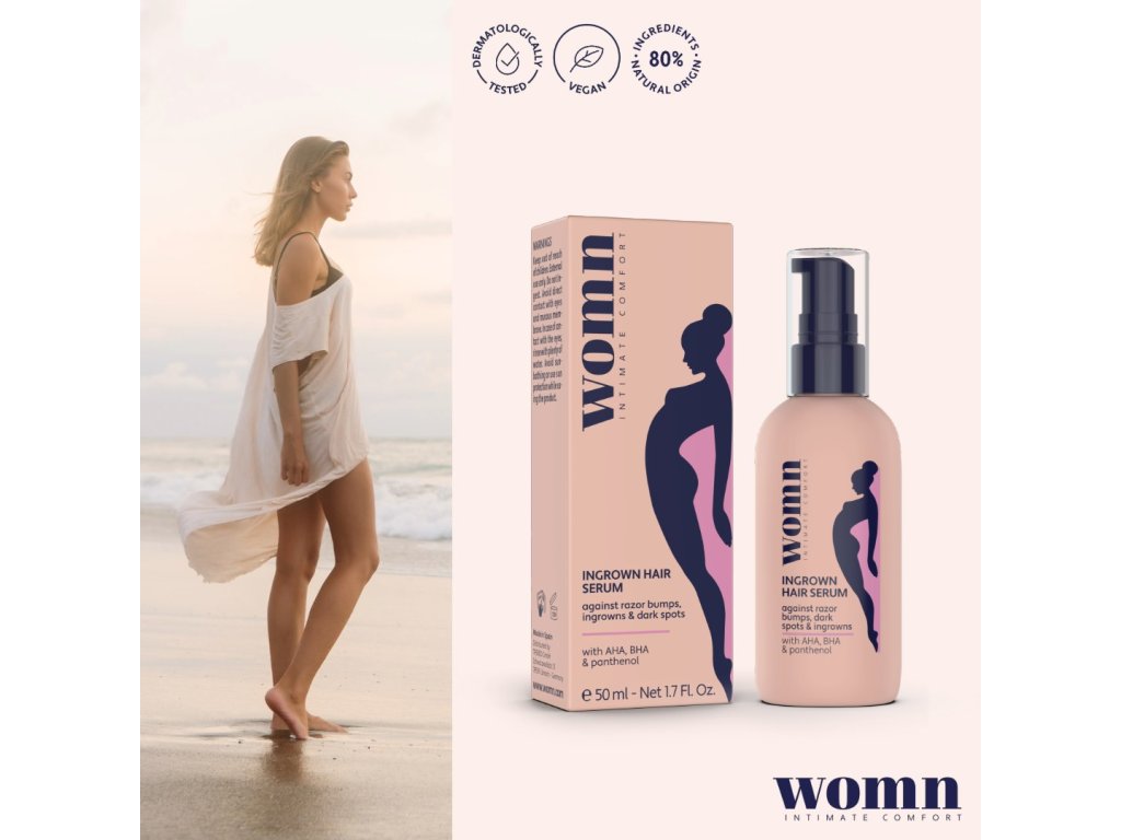 Serum WOMN delikatnie pielęgnuje wrażliwą skórę, redukuje wrastające włoski i zapobiega ich ponownemu pojawianiu się.
